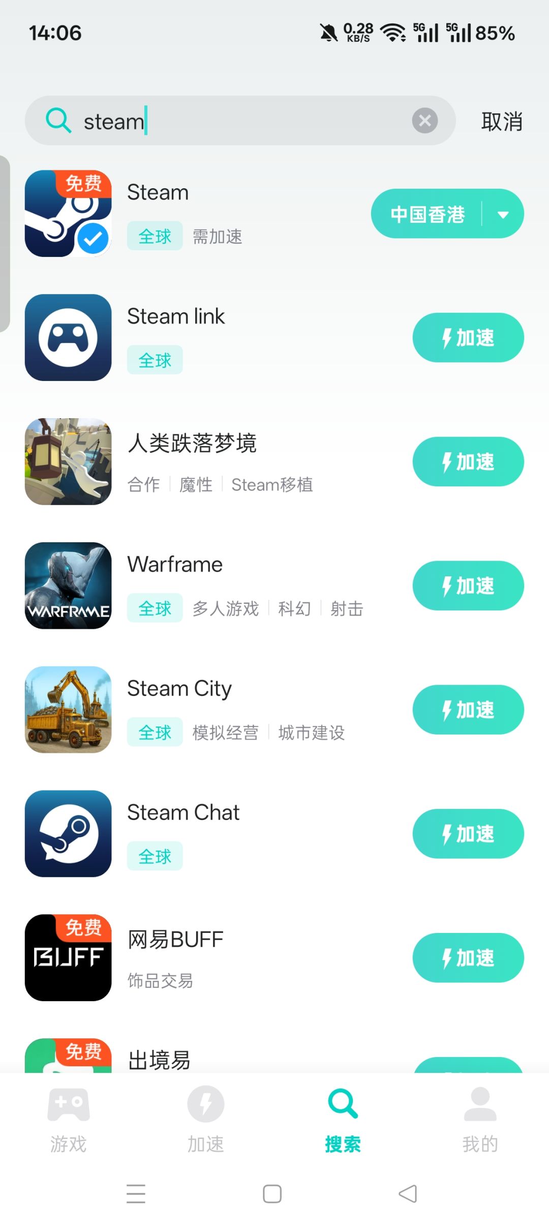 第四步,打开UU加速器搜索steam(一般安装完steam就会在加速页面显示),选中国香港,开启加速