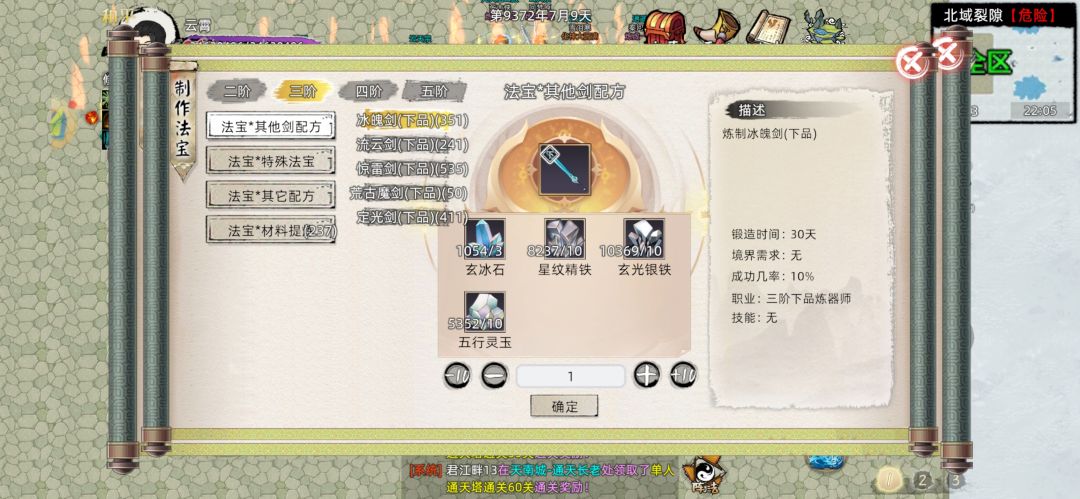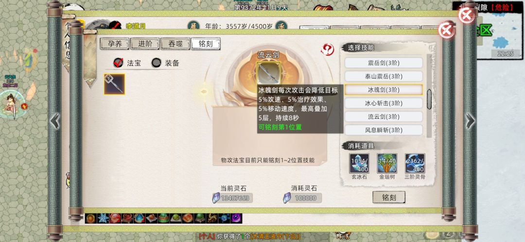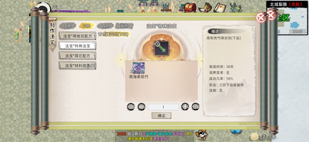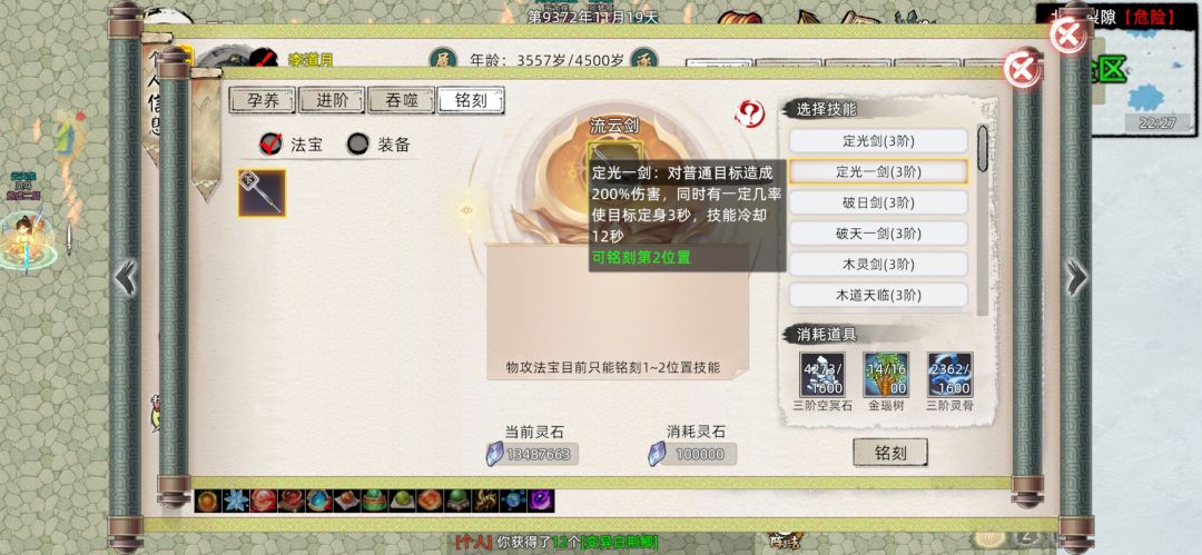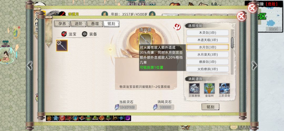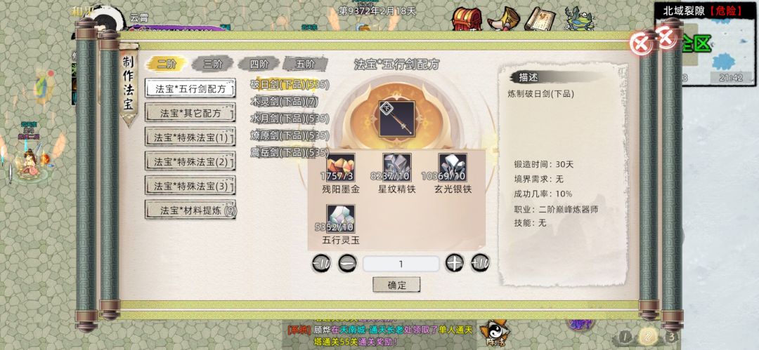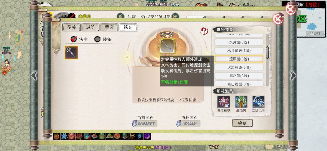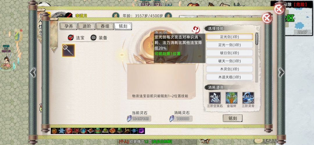 并且这些法宝最大的特征就是不论是三级到四级还是同阶品质突破,概率都不是100%,而是根据法宝持有者的炼器点数和炼器师等级决定,而其余的不论是活动材料法宝,还是防御法宝,还是新出的绳子和珠子,概率都是100%,跟本不用担心升阶突破失败的损耗(碰见逆天的孕养100概率失败bug当我没说)。