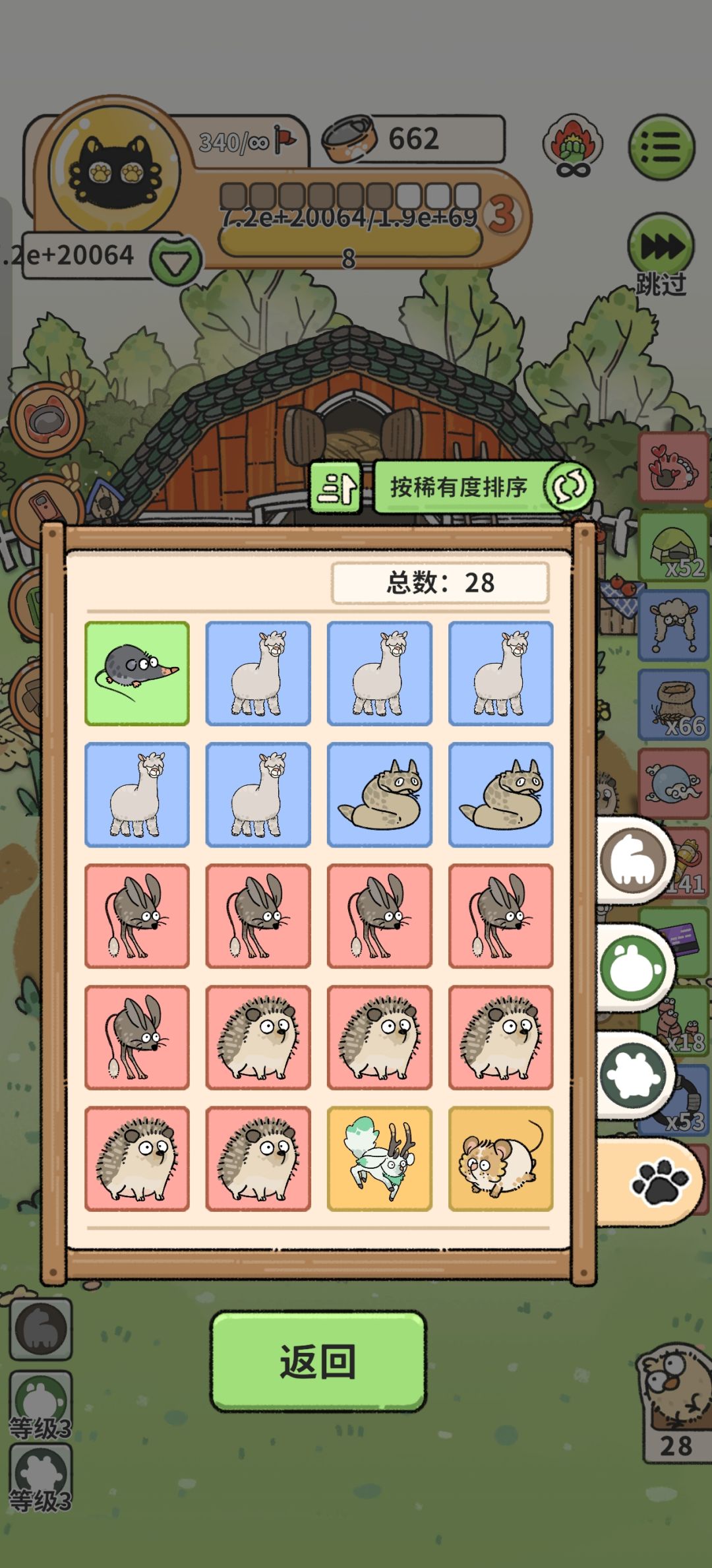 28只动物最终版,金币每日突破2w了,实在点不动了,每天平均12的增长,不知道什么时候是个头,无奈结束游戏