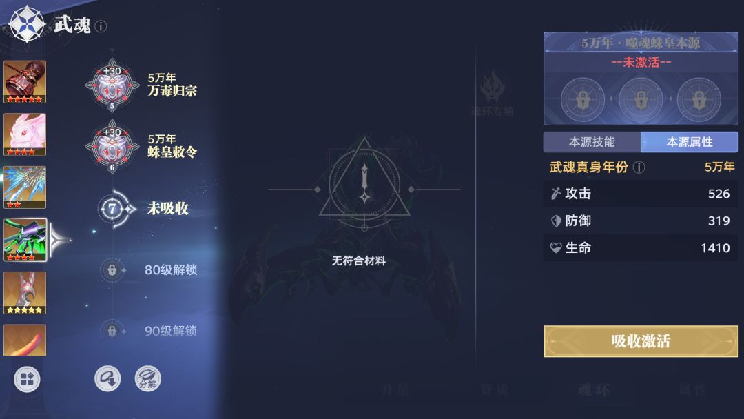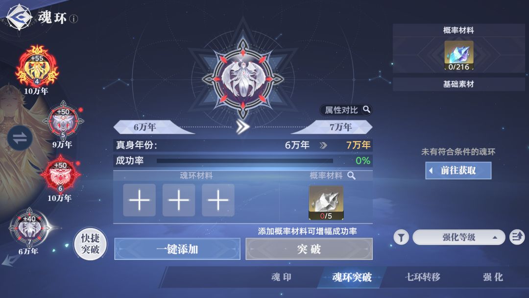 突破规则:和其他魂环的突破逻辑完全一致,需要消耗突破石头和5万年魂环狗粮来提升年份。
