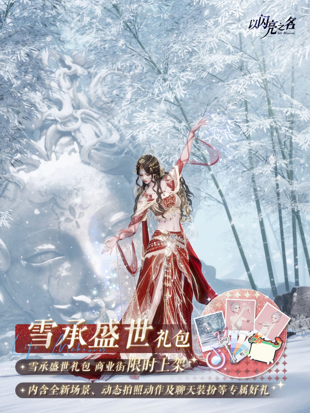 限时礼包售卖期间,合伙人可以4.6折的价格直接购买【雪承盛世】外观礼包,内含摄像机镜头动态动作【忘尘拂雪】、拍照场景【雪覆山河】、拍照动作【顾影惊鸿】、拍照运镜【忘尘拂雪】、聊天气泡【游龙献瑞】、背景音乐【忘尘拂雪】、潮流色卡*26和遇之钥*40,该礼包永久限购1次。