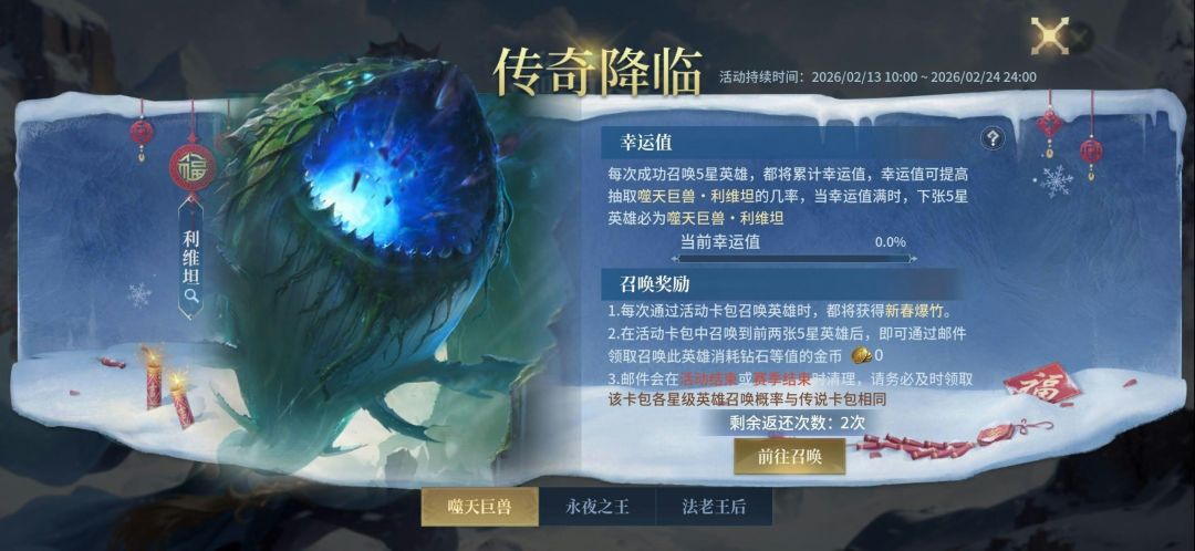 限时卡包中每召唤到1张五星英雄都将增加幸运值,幸运值会增加召唤到卡包专属英雄的概率,幸运值为100%时召唤到的下张五星英雄必为卡包专属英雄。