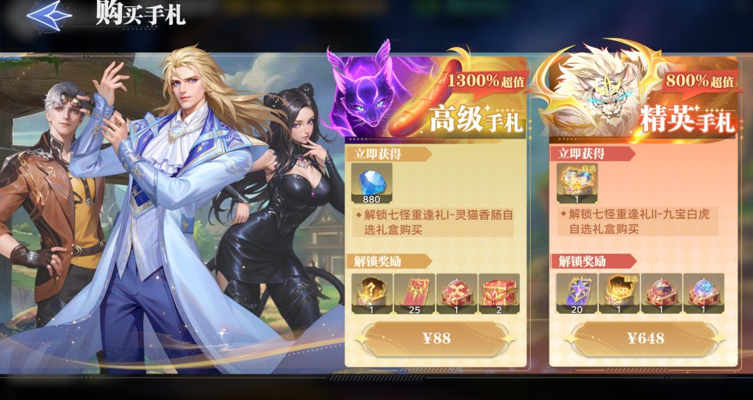 ➢ 高级手札:购买后立即获得钻石,同时解锁七怪重逢礼Ⅰ—灵猫香肠自选礼盒(包含幽冥灵猫、香肠武魂)购买资格,提升手札等级可获得随机SSR武魂、自选SSR魂核、仙草自选礼盒、武魂觉醒券等奖励;