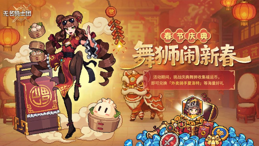 活动说明:活动期间,挑战「舞狮闹新春」副本收集福运币,可在活动商店兑换「外卖骑手夏洛特」、夏洛特骑士碎片、骑士召唤券、武器召唤券以及随机史诗符文等丰厚养成资源奖励!