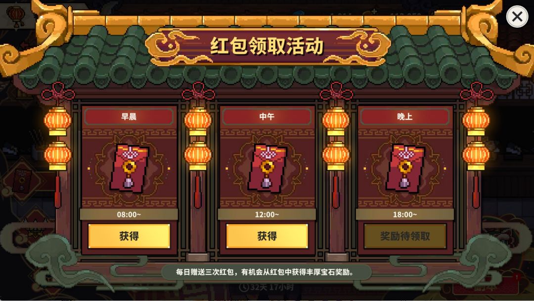 活动说明:活动期间,每日三个时段可在「幸运庆典」领取红包,在背包中点击使用即可获得数量不等的宝石,最高可开出宝石*1688!
