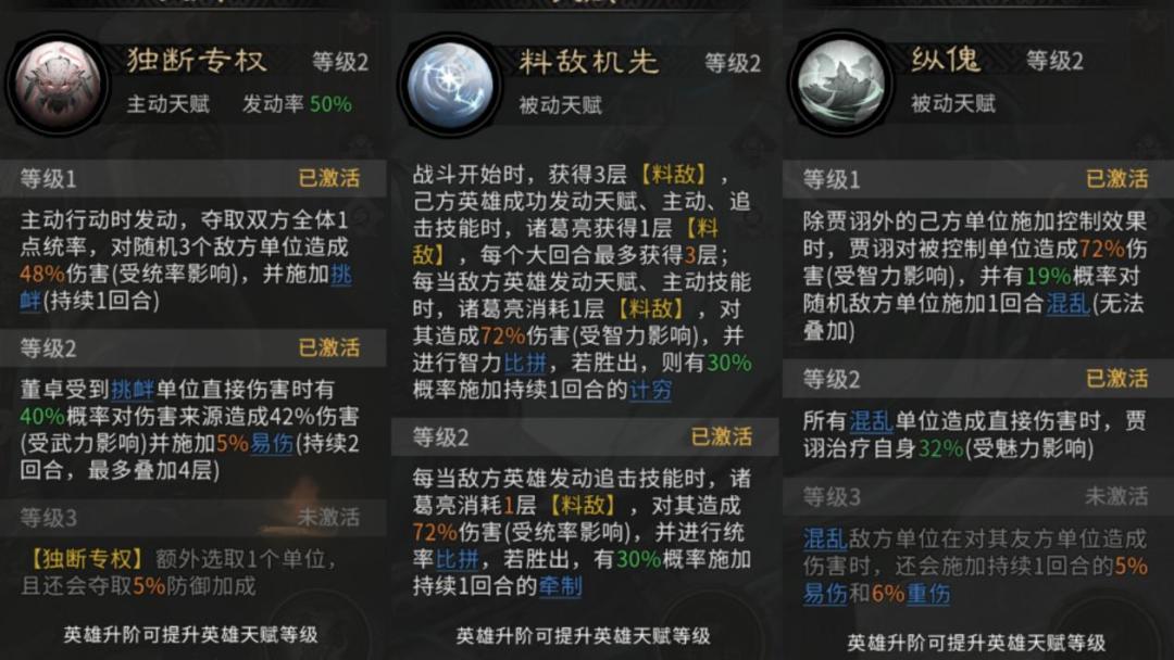 董卓天赋【独断专权】发动时,将夺取敌我双方全体一点统率,并随机挑衅三名敌方单位,同时对其施加【易伤】状态。该技能会连锁触发贾诩的天赋【纵傀】,对目标造成额外伤害,并有概率附加【混乱】效果。