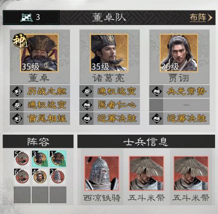 兵种站位:在董卓的下方放置一个西凉铁骑,在诸葛亮和贾诩后方各放置一个五斗米祭。