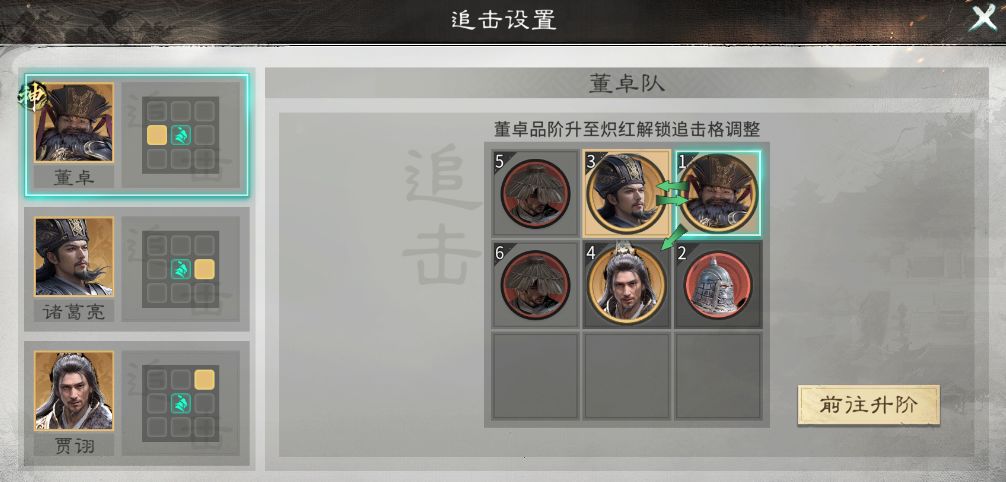 英雄站位:贾诩不站追击格,董卓站贾诩追击格,并与诸葛亮互站追击格。