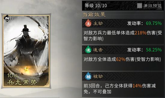 主动技能固定携带【兵无常势】,该技能可精准攻击敌方兵力至低的单位,作为高效的“补刀”手段,能确保我方集火目标快速减员,有效避免伤害分散、无法击溃敌方的尴尬局面。