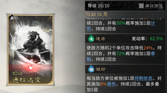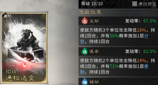 追击技能固定携带【通权达变】,随机降低两个单位24%攻击;概率附加【牵制】。【牵制】可触发贾诩【纵傀】,造成额外伤害。