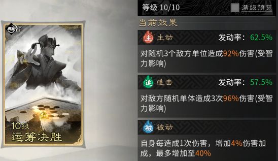 被动技能固定携带【运筹决胜】,该技能可提供高达40%的伤害加成上限。配合天赋【纵愧】的多次触发,能在战斗前期瞬间拉满被动层数。