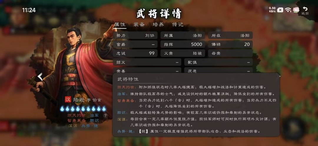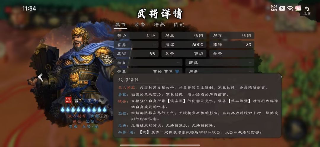 曹仁特性比较全面,各方面都有涉及,陆逊的基本上都是加伤,所以陆逊有个很尴尬的地方,就是作为一个近战法师,在AI手里极其容易被俘,因为武力太低,也没有不易被俘的特性。