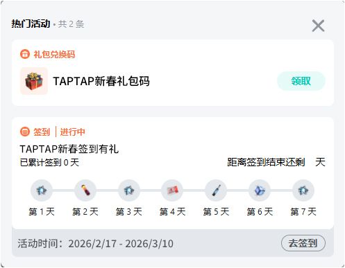 活动期间,登录 TapTap《锚点降临》详情页,即可领取 TapTap 专属新春礼包码,还能参与新春签到有礼活动!