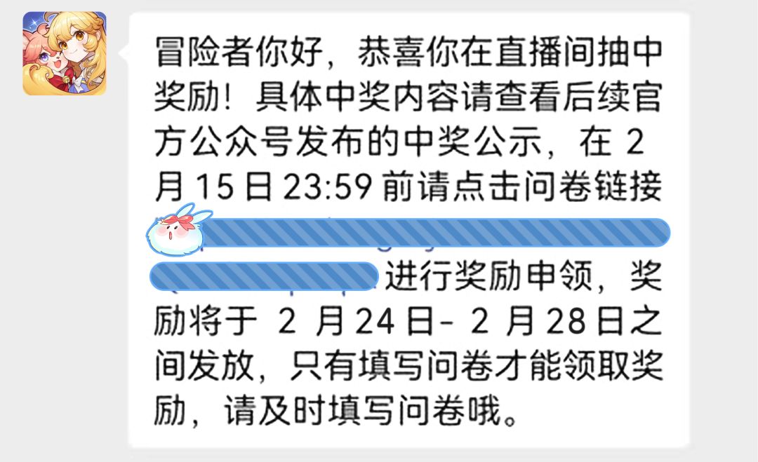 1、2月9日~2月15日为公示期,请中奖用户按照公示文章内的奖励领取规则,填写奖励申领问卷,问卷将于2月15日23:59截止征集,过期未填写问卷则无法领取奖励;