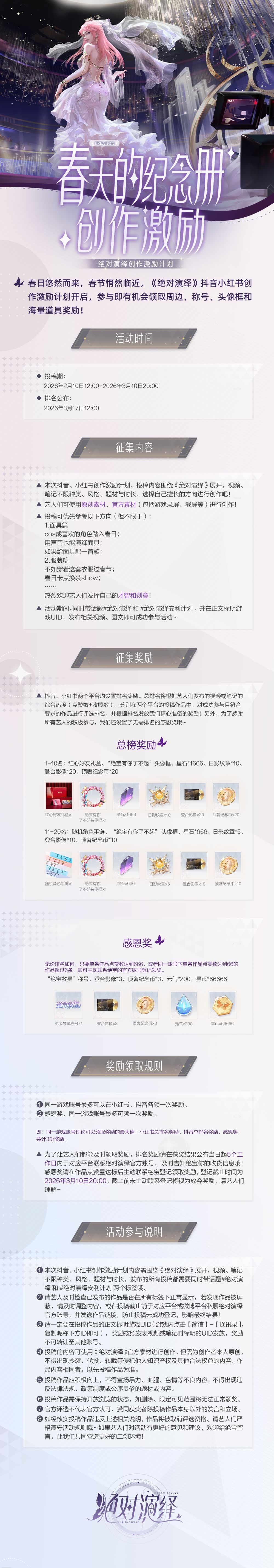 趁此寒假假期,娱记我和同哥决定推出“春天的纪念册”绝对演绎抖音小红书创作激励计划!本次活动我们同样准备了丰富的周边,以及称号、头像框、星石、登台影像、顶奢纪念币等海量道具奖励哟~