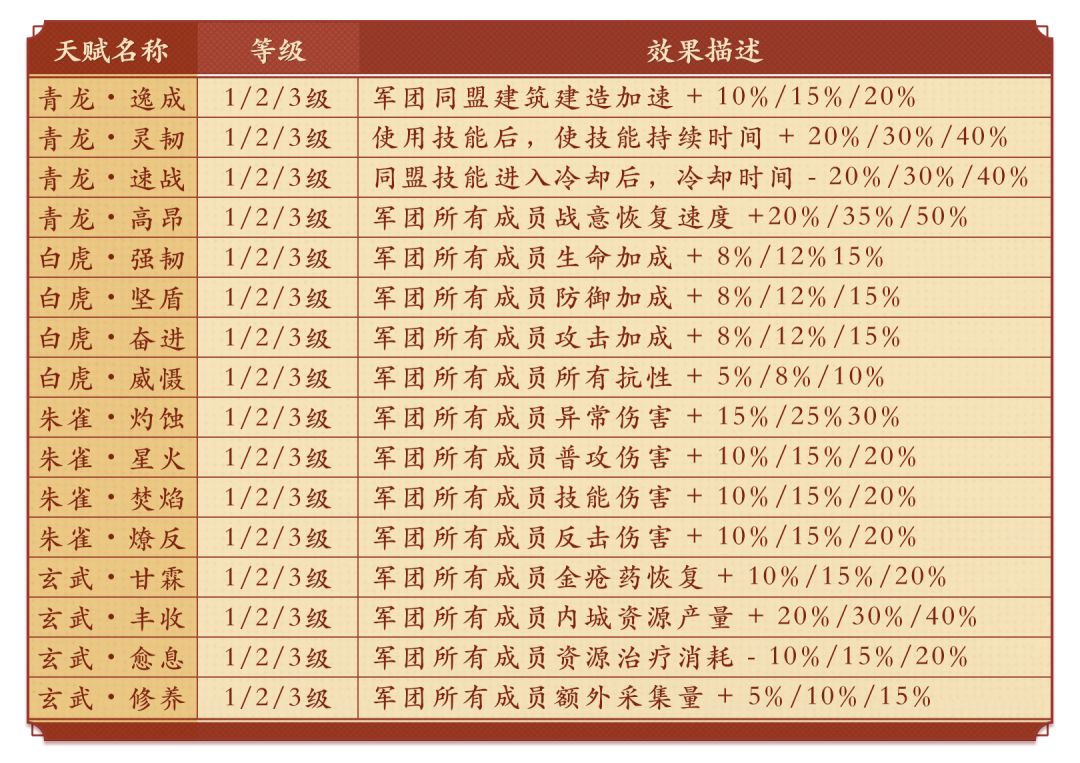 · 青龙:用于加速同盟进度,迅速恢复同盟技能,建造同盟建筑,恢复战意;