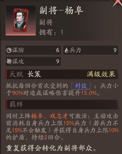 抵抗每回合首次受到的「封技」;兵力小于90%时造成谋略伤害提升15.0%。