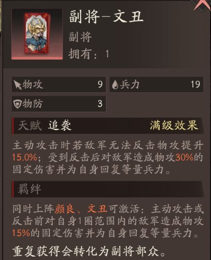 主动攻击时若敌军无法反击物攻提升15.0%;受到反击后对敌军造成物攻30%的固定伤害并为自身回复等量兵力。