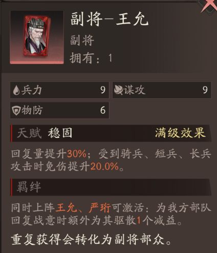 回复量提升30%;受到骑兵、短兵、长兵攻击时免伤提升20.0%。