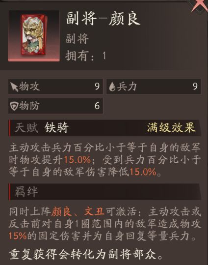 主动攻击兵力百分比小于等于自身的敌军时物攻提升15.0%;受到兵力百分比小于等于自身的敌军伤害降低15.0%。