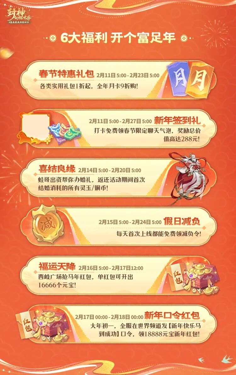 接下来小妖要介绍的,就是春节期间的全服福利啦,免费的元宝、减负令、至尊灵饰、婚礼...还有9折全年月卡都在这里啦~