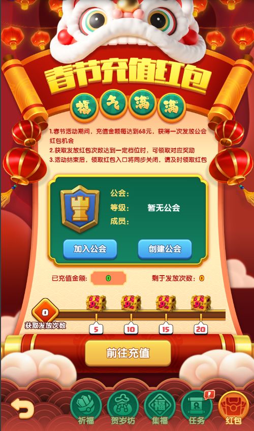 活动期间,充值每达到一定金额,就会获得发放公会红包的机会。发放一定次数后还可以领取玉碟礼包、珍宝自选碎片等额外奖励!