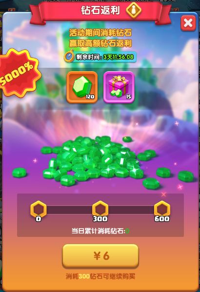 当日累计消耗钻石达到一定档位后,可以购买对应礼包,赢取高额钻石返利!