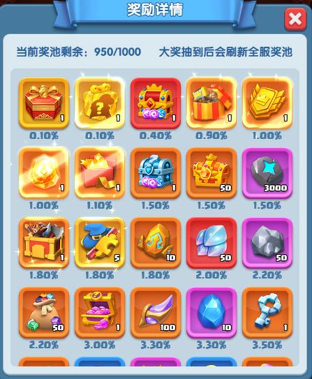 温馨提示:奖励详情所显示的抽奖概率,是奖池内满道具时,单抽获取对应奖励的概率。