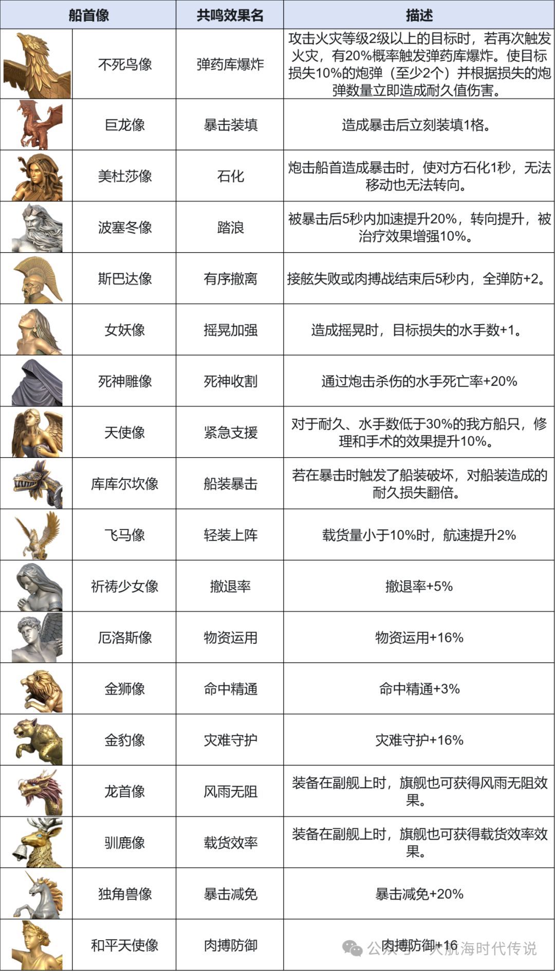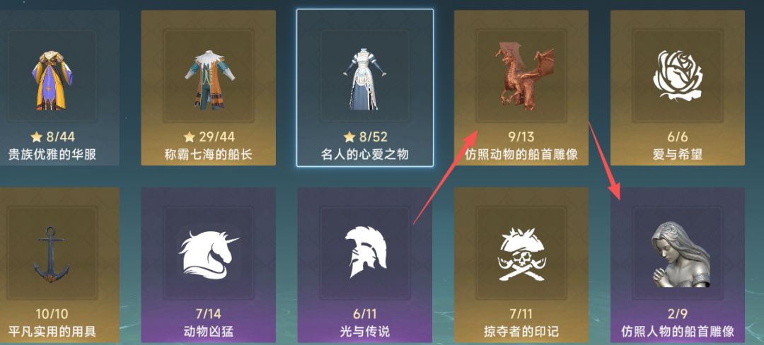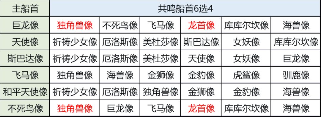 (2)共鸣组合不是固定组合。我们船长收藏里仿照动物的船首雕像及仿照人物的船首雕像都有各种品质的船首像!其中金色品质以上可以组合,(目前了解到的是传奇生物、动物、神祗、战争与和平这几个系列,但系列内的是可以任选随意组合的。)