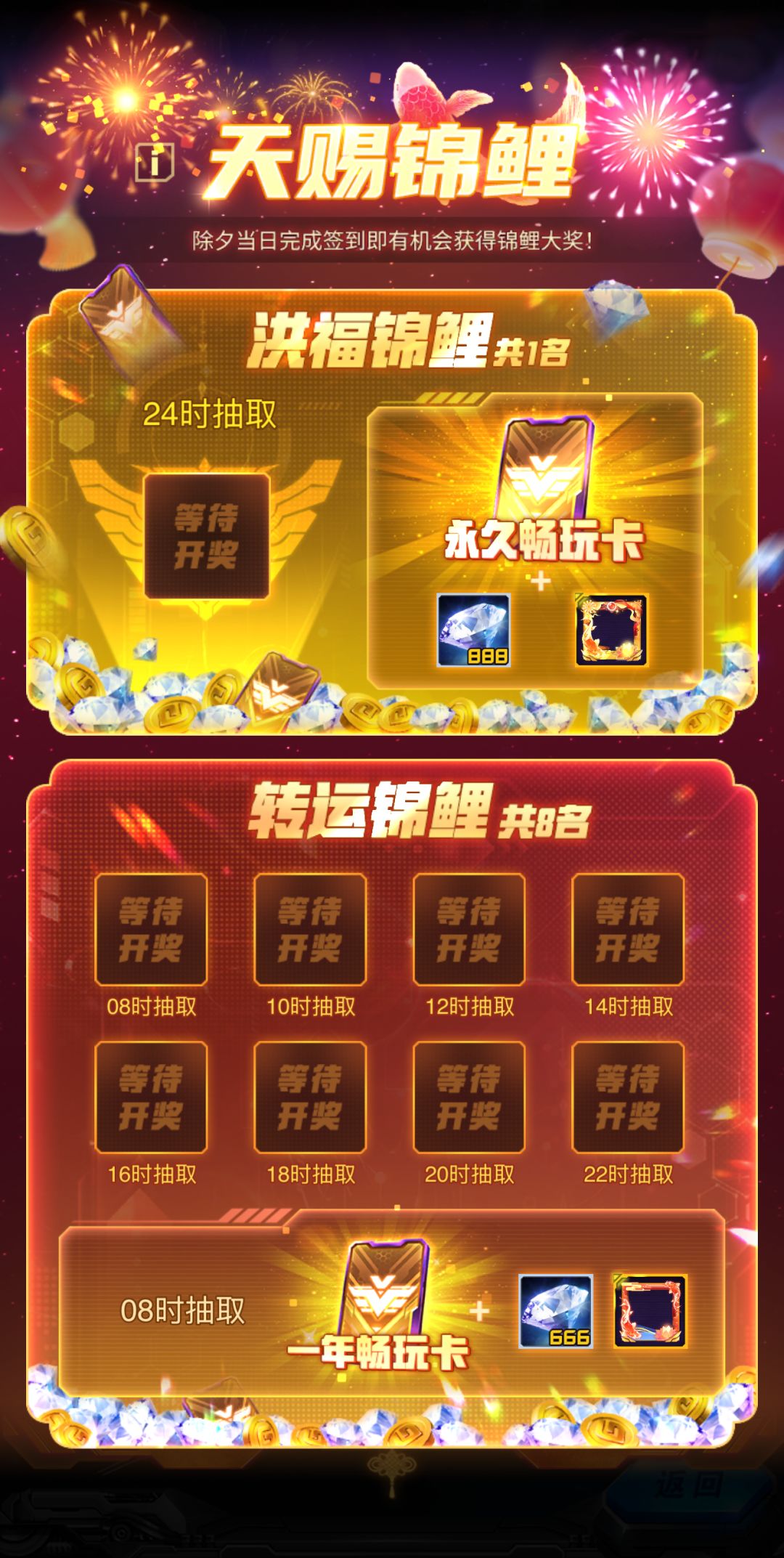 新春贺岁,签到有礼!锦鲤大奖蓄势待发,你的好运正在路上。每日签到领好礼,消耗体力可得补签卡,错过也不怕!除夕与元宵当天8点开始每两个小时抽锦鲤大奖!