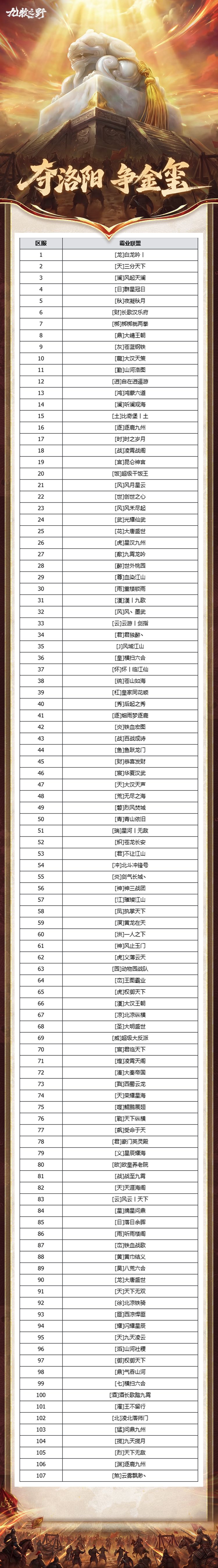 现对公测首日开启的107个区服中,问鼎洛阳的联盟名单进行统一公示: