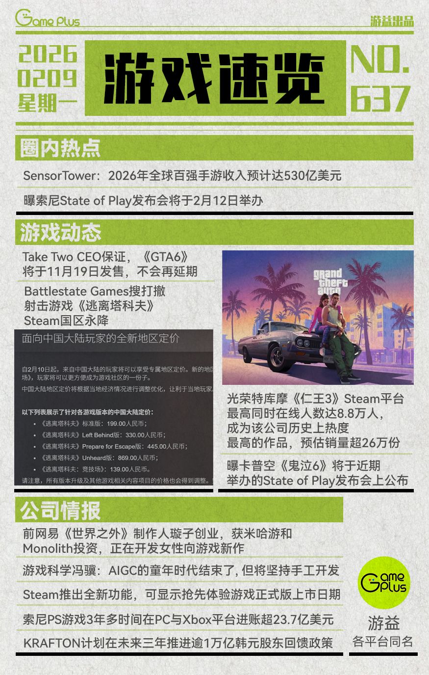 1.Take Two CEO保证,《GTA6》将于11月19日正式发售,不会再延期