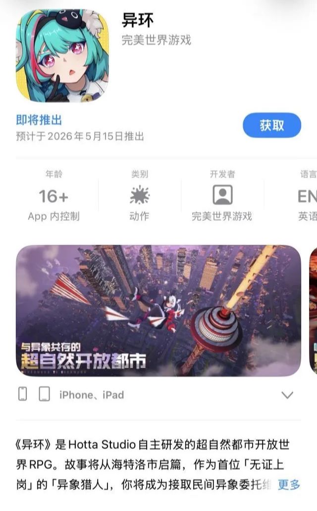 2月8日,异环官方正式宣布游戏将于5月15日启动全球公测,目前App Store已开放预约预约达到指定人数可解锁总计20抽与角色哈尼娅等丰厚奖励这款由完美世界Hotta Studio研发的超自然都市开放世界RPG,自2024年7月公布以来,凭借其独特题材与创新玩法备受关注![[TapTap表情|TapFamilyxdoro2_粉狗比心]](https://img.tapimg.com/market/images/101c7e3200596fe8e03765080b467fb8.gif)