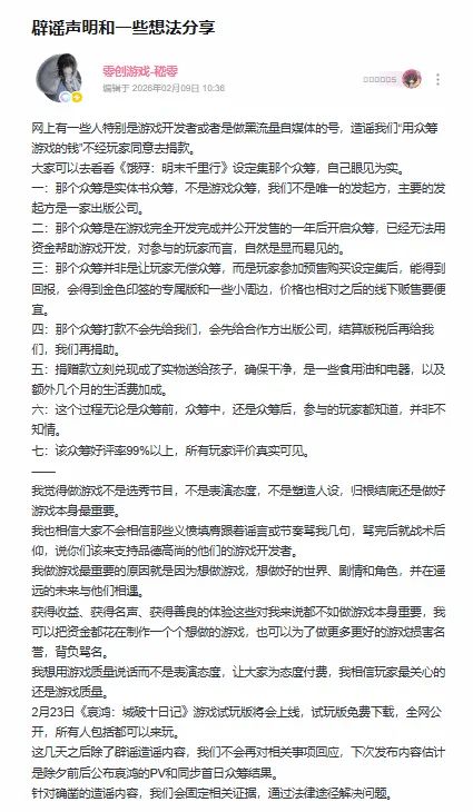 近日,由零创游戏开发、衍生自百万销量国产文字冒险游戏《饿殍:明末千里行》的新作《哀鸿:城破十日记》,因众筹事宜陷入舆论漩涡,相关争议在游戏圈持续发酵。面对网友与自媒体的质疑,官方发布强硬声明,直指相关传闻为不实信息,明确否认“挪用玩家众筹资金捐款”等核心指控。