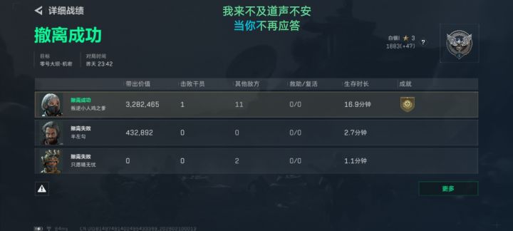 去军营管道调查,然后撤离,期间三次大招扫,麦晓雯大招削到120秒,但我可以等,大招开,切刀狂奔,大招结束躲起来,一直到撤离点。我300万身上现在,四头四甲四弹,打架我不怕,但敌人没有义务必须和我正面打,敌人也没义务不能在我身后背刺我。