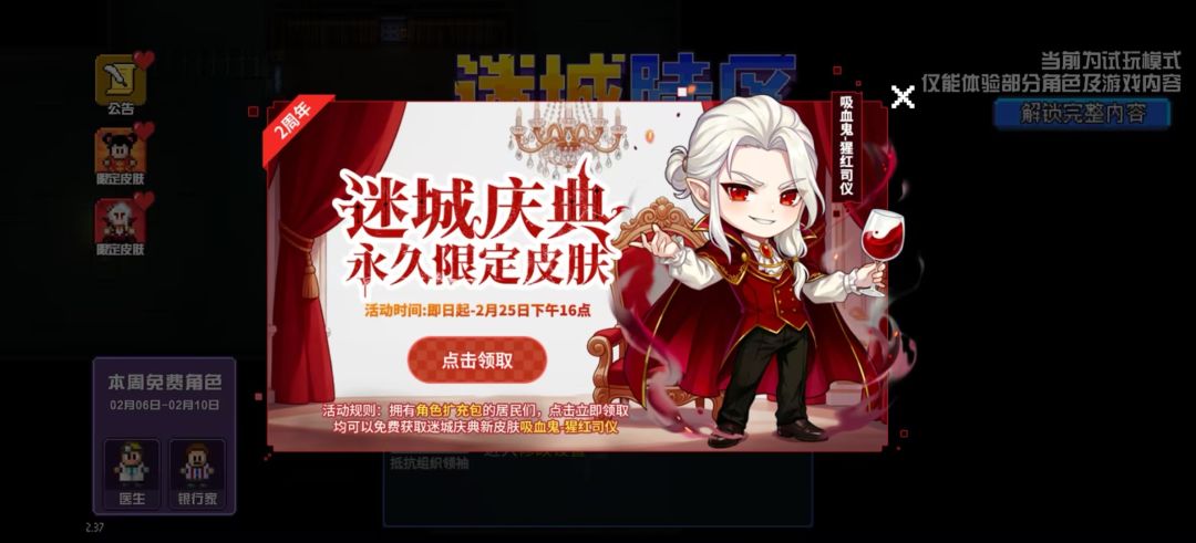 获取方式:拥有"角色扩充包"的居民,即可在游戏中领取【吸血鬼-猩红司仪】限定皮肤
