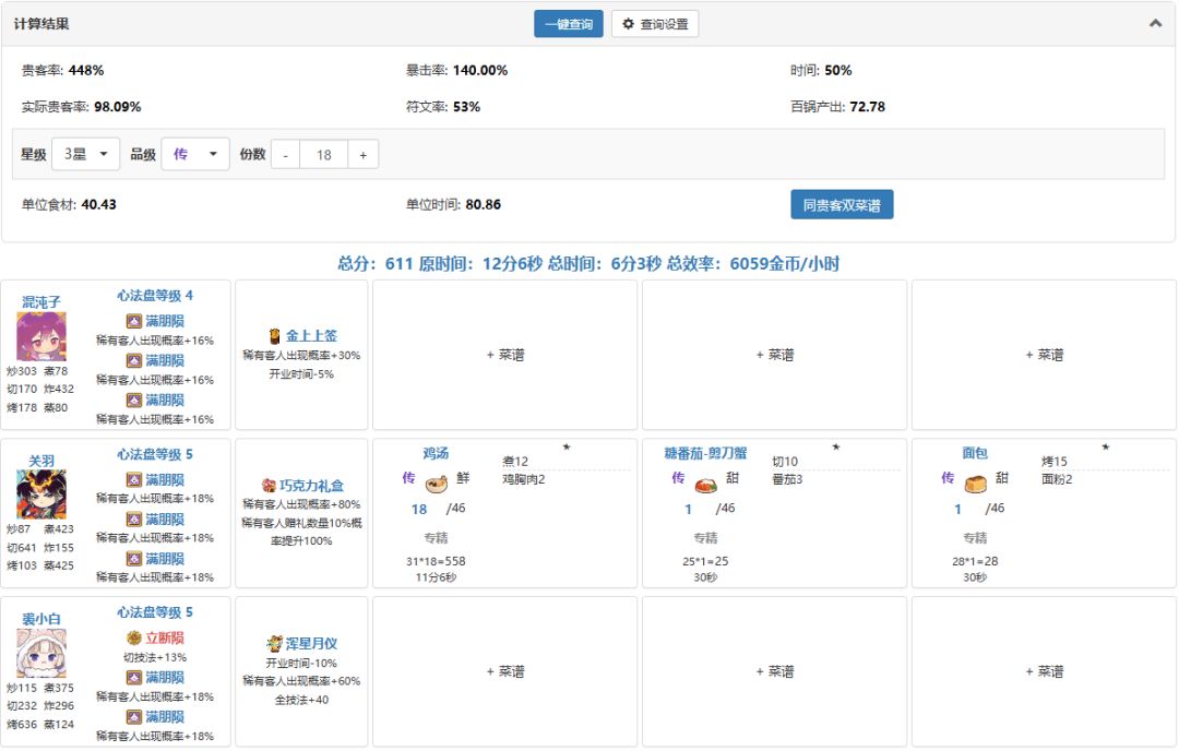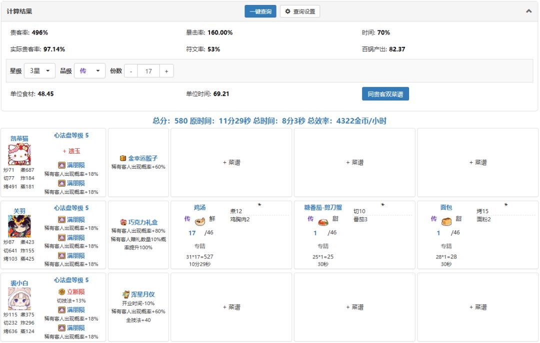 123火刷玉璧和符文是贵客率越高越好,一般是做(必来份数-1)份,因为多出来的一份会导致贵客率溢出而浪费,但是图中残雪队的贵客率是100.23%,这个时候如果少做一份损失更多,所以就得做到必来份数。有想法的可以用图鉴网计算下自己的编队最好做多少份。
