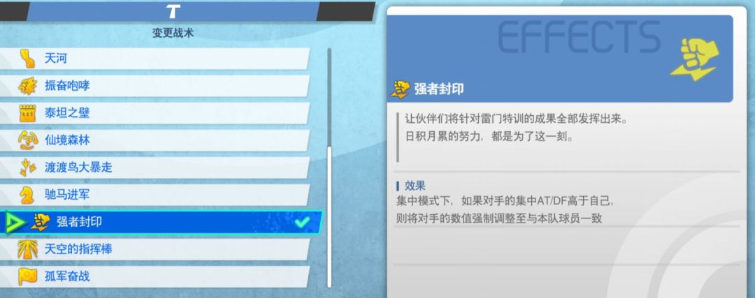 不过虽然踢球的方式魔改成了这样,但在规则上确实没什么变的,正常足球该有的开球、守门、传球、铲球、1V1拦球博弈、射门等规则基本都是现实怎么搞这里就怎么搞,那么它是如何让自己的战斗看起来像JRPG的呢?是的孩子们,在守门、传球、射门等这些需要进行“战斗”,且非常看球员个人的能力的环节,本作就直接搞成了一个小型的战斗:在带球过人的时候,你可以选择直接用数值碾压强行穿越,也可以选择开启技能跟他来一场数值上的比拼。