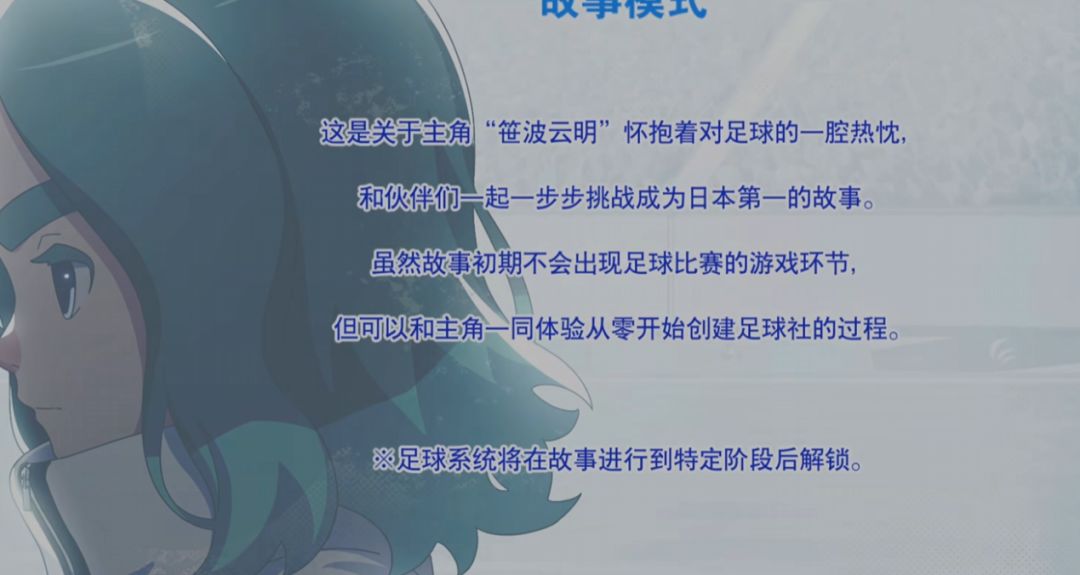 在剧情模式中,我们将扮演一位因为心脏病而不得不放弃足球梦想的足球天才笹波云明,他虽然嘴上说着“足球什么的从世界上消失了才好”“不想再看到足球了”,但这些都只是骗自己的气话,他的内心实际上仍旧是那个热爱着足球的少年。