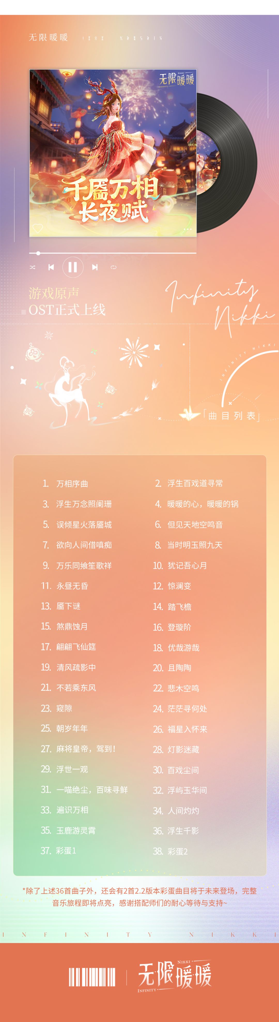 >《无限暖暖——千靥万相长夜赋》专辑共收录38首由叠纸旗下原创音乐团队FoldEcho出品的原声音乐。