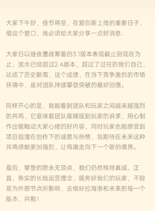 很难想象库洛又在一个版本的篇幅里成功塑造了主角和爱弥斯两个角色,同时收割了玩家的眼泪、口碑和钱包。经过松伦证实,3.1版本甚至刷新了2.4版本的流水纪录,成为了鸣潮首日流水最高的版本。