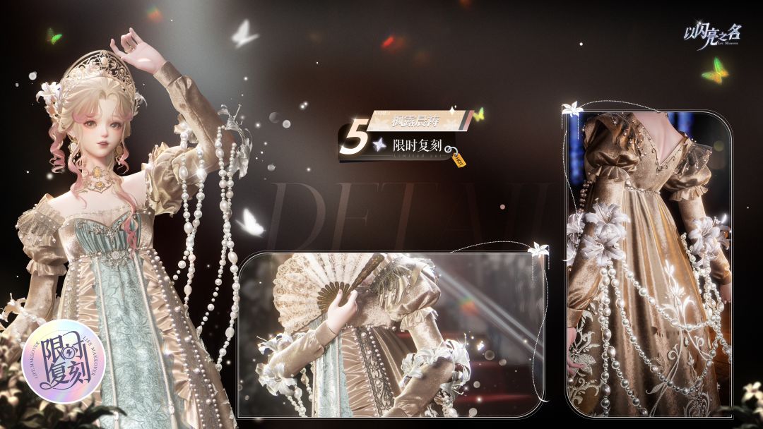 手持扇子可开合,扇面与裙身使用繁复的百合蕾丝花纹相呼应,同时扇子带有蝴蝶飞舞的特效,丰富帝政裙的氛围感。