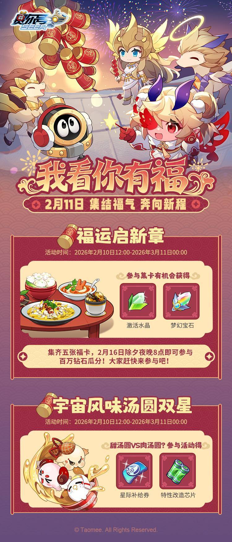 如何参与:微信搜索「淘米会员中心」小程序,选择「赛尔号手游」,点击下方「我看你有福」春节活动入口就可以参与啦