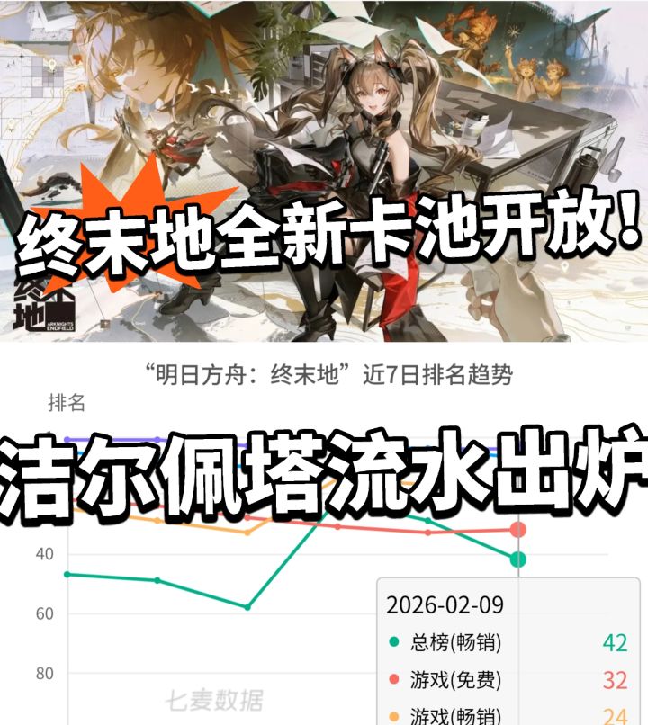 大的来了家人们!近日 明日方舟终末地开启第二期卡池,新角色洁尔佩塔 上线,截至2月10日,游戏流水依旧稳定在榜,总榜第29、畅销榜第17,热度依旧高涨。
