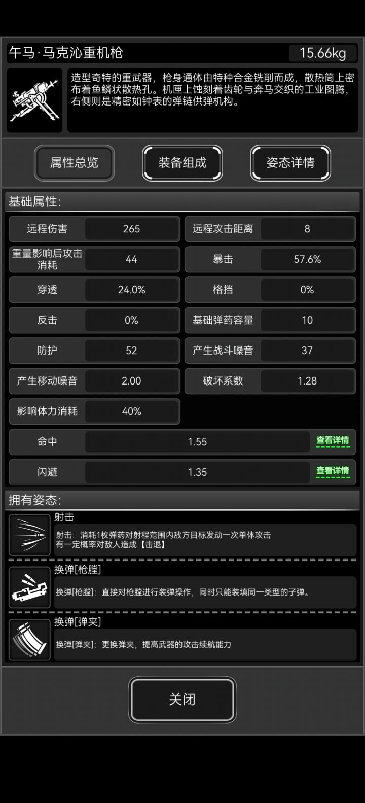 以上两把武器我个人评价是马弓低成本好用,马克沁食之无味弃之可惜。马克沁和蛇加在相同配置相同弹药下,伤害和攻击消耗都是蛇加占优,马克沁仅在穿透上有细小优势,由于步枪界的大山550可台修,伤害高,马克沁的地位非常尴尬,马弓维修性价比高,伤害高,个人觉得不好的是特殊姿态,如果不是竖着放火焰陷阱而是在身前几格横着一排火焰陷阱,我对它的评价会更高。