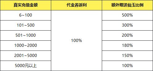 凡在本次“破虚测试”删档期间有过任意充值行为,均可在后续公测服务器中根据同账号充值全额返还代金券,代金券可1:1替代现金支付,除代金券外,还会根据充值总额额外赠送海量仙玉,详情如下: