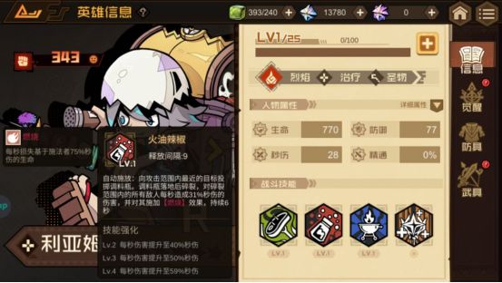 技能介绍:向攻击范围内最近的目标投掷调料瓶。调料瓶落地后碎裂,对碎裂范围内的所有敌人每秒造成31%秒伤的伤害,并对其施加【燃烧】效果,持续6秒