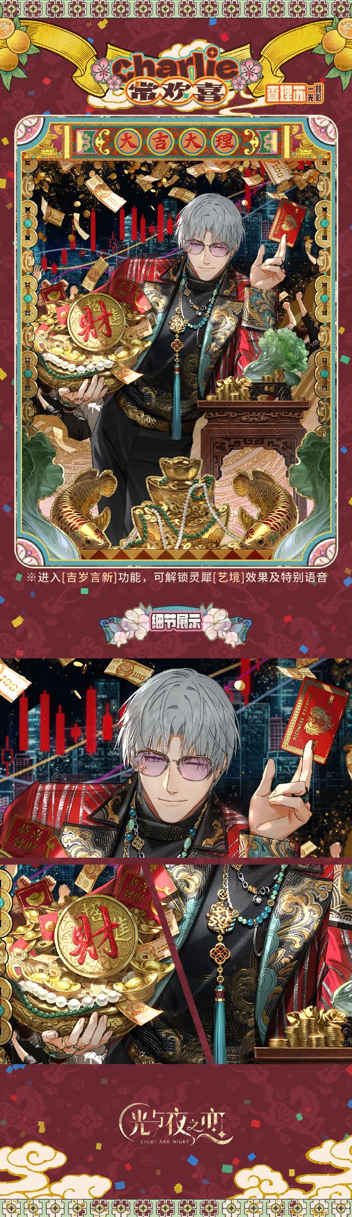 [6星]灵犀 查理苏・常欢喜 一段含[艺境]效果。进入[吉岁言新]功能,可解锁灵犀[艺境]效果及特别语音。