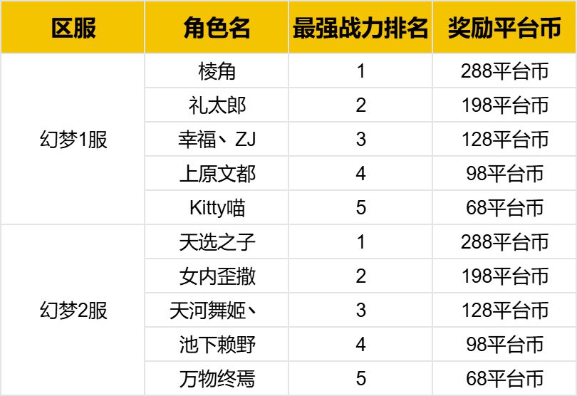 【排行榜奖励】个人战力排行榜前五奖励平台币