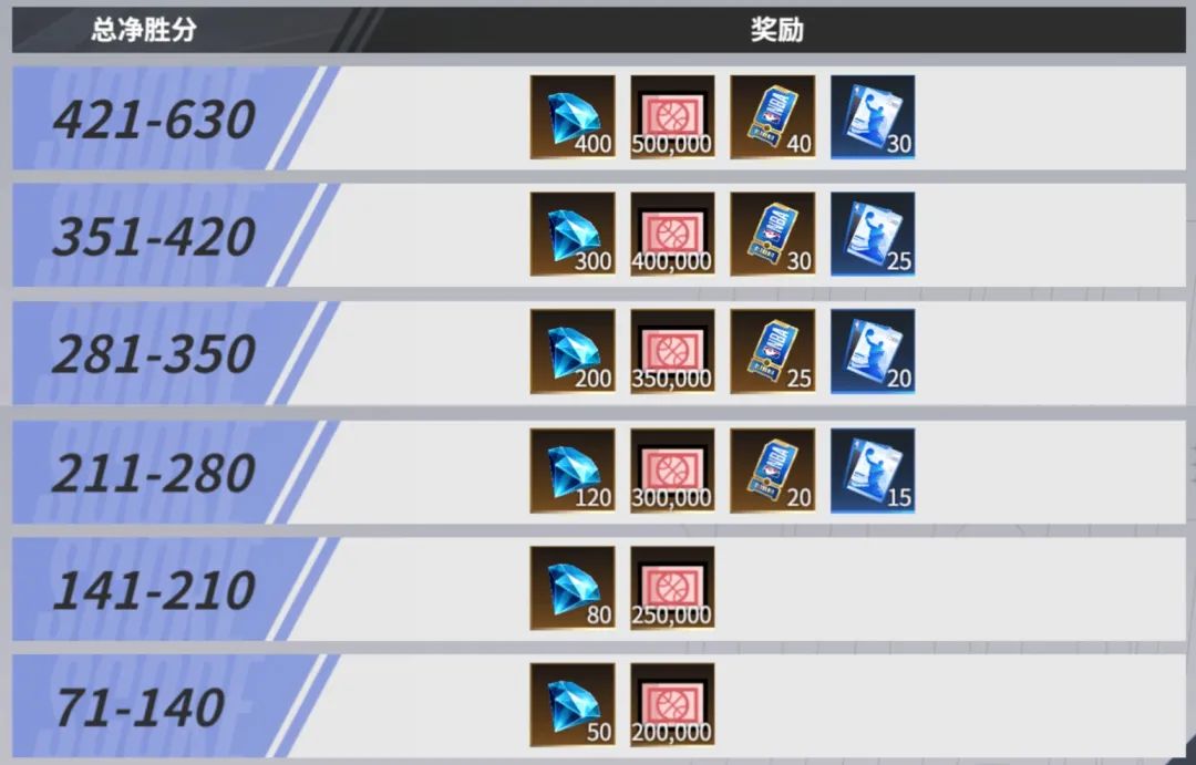 除单关通关奖励之外,活动结束后将根据总净胜分发放奖励,最高可获得钻石×400、抵税额50万、球星抽卡券×40、球星动作卡×30。